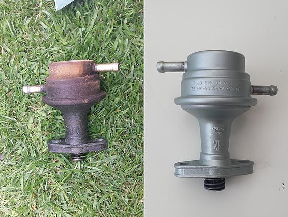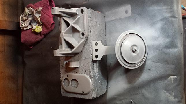 For the fuel pump, alternator bracket and a few other parts I’ve used Eastwoods Primer and Eastwoods silver cad. Its a matte silver and looks and holds well. Below is the fuel pump before and after. The process was degrease, wash with water, wire wheel, degrease again, wash, prime, paint.